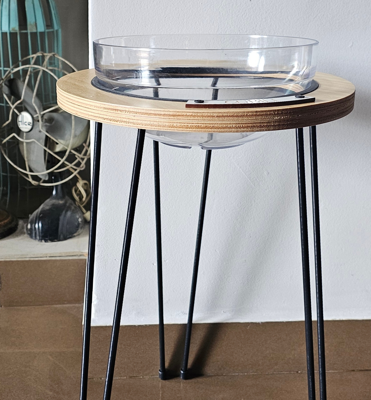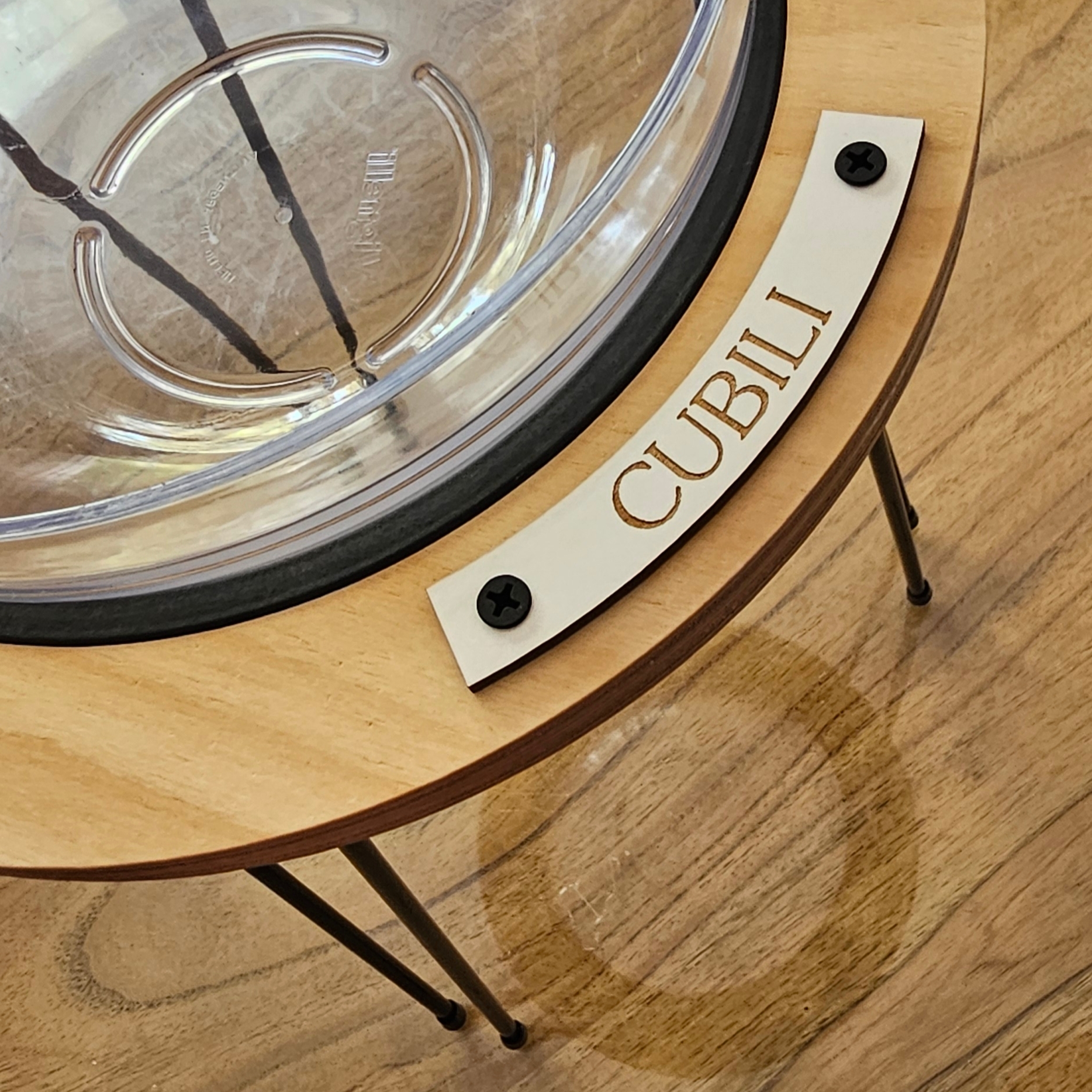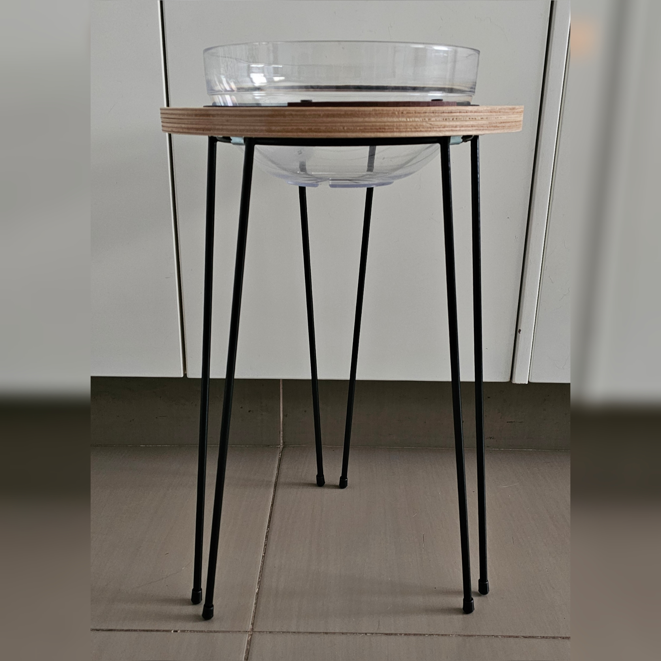 Fabricado con materiales nobles y de alta calidad, combina una estructura de hierro con pintura epoxi —duradera, firme y resistente—, un aro de madera guatambú protegido con barniz natural que aporta calidez, y un cuenco de policarbonato irrompible, seguro, liviano y apto para lavavajillas y microondas.